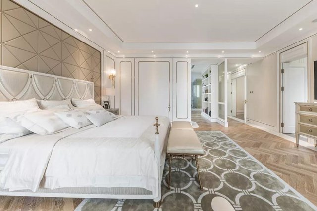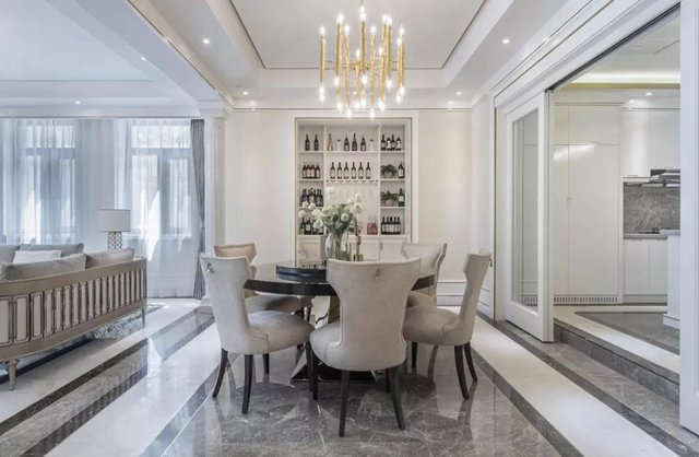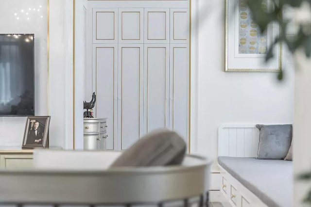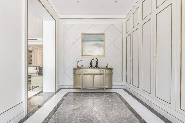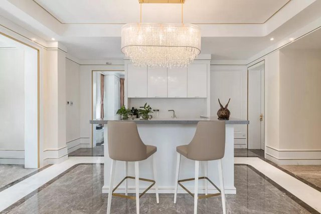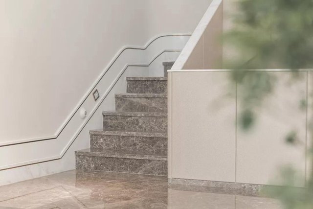 二层是孩子们的生活空间成长空间,公共区域和楼梯间的感觉追随整体空间风格,把统一的设计语言展现的淋漓尽致。地面与楼梯的铺装采用天然理石,在土耳其灰、波斯灰和雅士白的交相辉映中再搭配入高级质感的双层纯铜金属条。共同结晶进行无缝处理后,四种纹理搭配出极为高贵精美的视觉感。