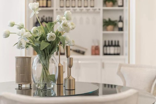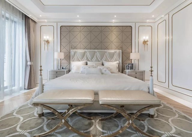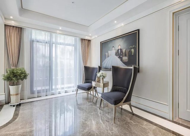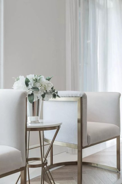 用柔和的圆角处理方式弱化边界的棱角,将顶面的纯铜金属封边、白色木质墙板的纯铜金属封边和地面理石的纯铜金属封边精致化、圆润化。统一和谐的设计手法、高贵优雅的材质搭配、精美绝伦的施工工艺,描绘出一个理想化纯净、甜美、高贵又富有情调的艺术空间。