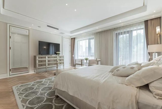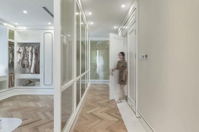 卫生间与衣帽间半开放的设计增大了空间的体积感,在动势和流动性上这个空间畅通无阻,且不影响相对私密和隐蔽的特殊空间。半开放性卫生间材质的选择也是精挑细择,在浴屏和隔断的选择上,设计师选用朦胧迷幻的夹绢玻璃,这不仅满足私密性的需要还给生活带来一丝情趣。