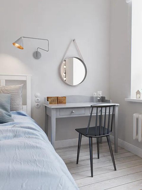 简单的一张桌子、一面镜子就组合成了完美的梳妆台,再加上两个置物架,