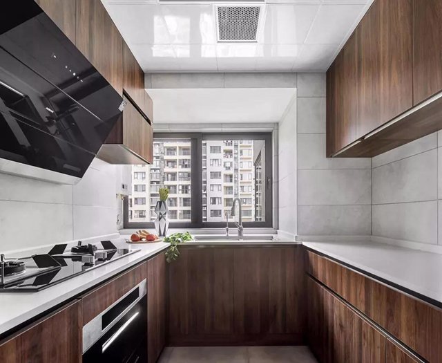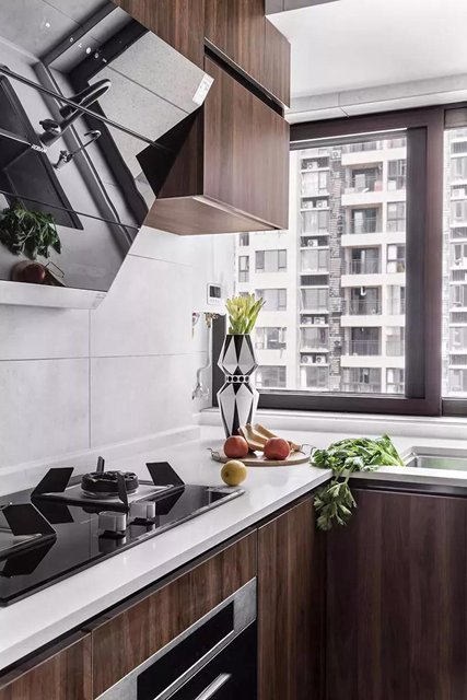 木质的橱柜构成一个U型的厨房格局,临窗的明亮采光,让烹饪更加宽松舒适。