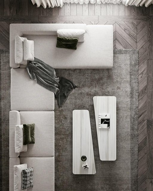 L形的直角沙发与不规则切割的茶几所形成的极致画面赋予舒适的艺术视觉。