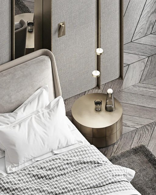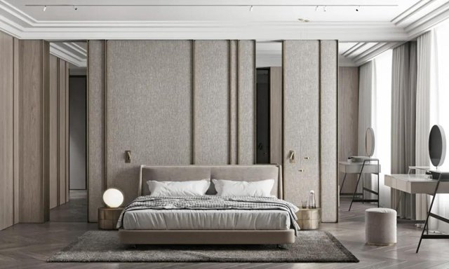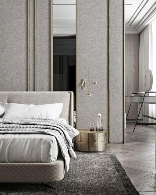 延续灰调的高级魅力,亚麻面料铺饰墙面,黄铜边线点缀,自然的味道温润柔和,空间变得安静而带点慵懒。