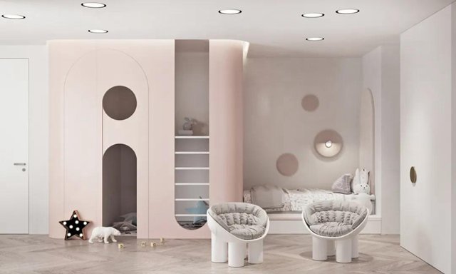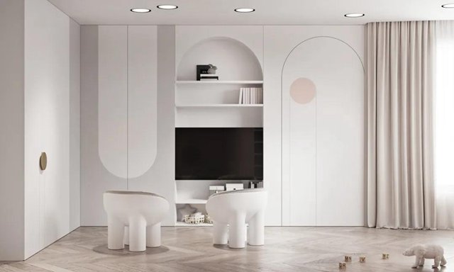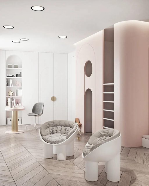 色让空间洋溢着青春明快的气息,拱形几何语言多次运用在室内,丰富墙面的层次感,同时提升了有趣的生活视角。
