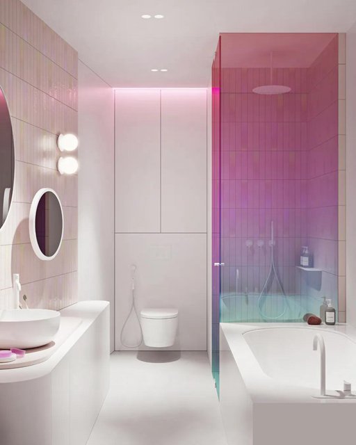 红绿渐变色的透明玻璃浴门极具吸引人的眼球,色调质感让浴室空间变得时尚个性。